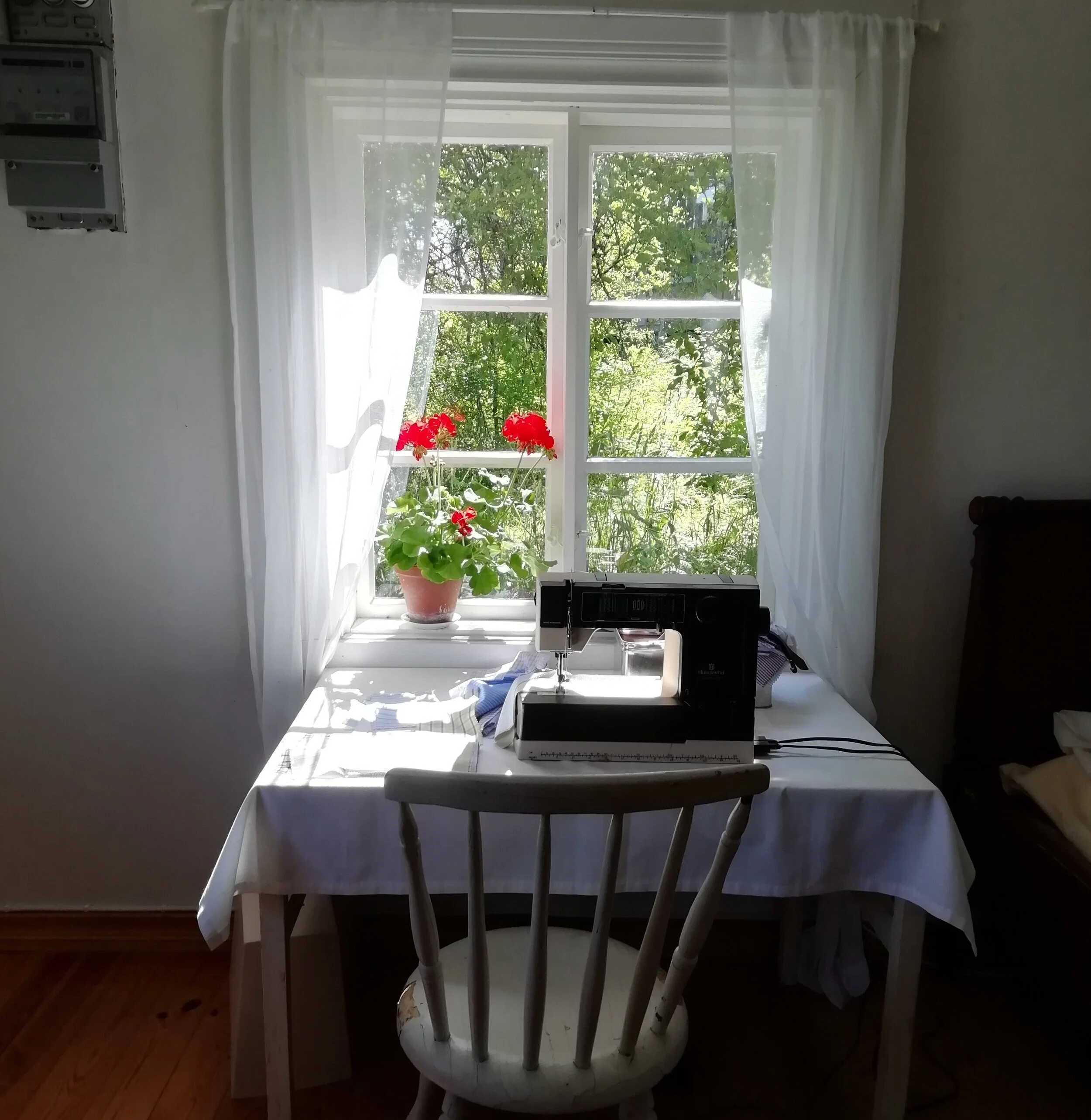 Mökissä oli kaikki tarvittavat huonekalut ja välineet kahdelle hengelle. Kierrätyskeskuksesta kävin hakemassa vähän lisää astioita mahdollisia kesävieraita varten. Ulkovarastosta löytyi lisää vanhoja huonekaluja, mm. nerokas tuoli, jonka avaamalla sai salin puolelle vierassängyn. Tähän asti kauneimman ompelupaikkani laitoin salin valkoverhoisen ikkunan eteen, johon valo siivilöityi vanhan omenapuun lehvästön läpi.