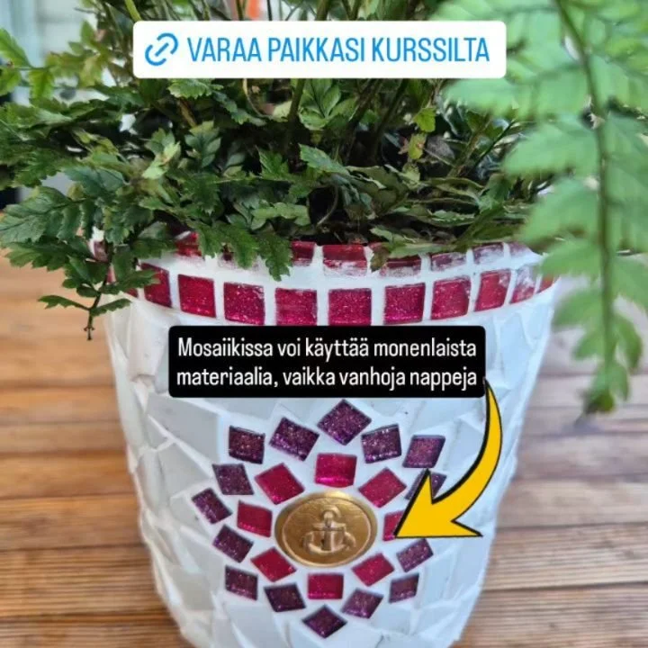 Kahden illan työpaja pidetään ihanassa Ingvastin killassa ma 20.4. ja ti 21.4. klo 17.30 alkaen. Et tarvitse aiempaa kokemusta, omia tarvikkeita tai välineitä. Kurssihintaan sisältyy kaikki mitä tarvitset mosaiikkipannunalusen tekemiseen. Jos pannunalusen sijasta haluat päällystää mosaiikilla vaikka kukkaruukun tai vadin, ota oma mukaan. Mosaiikilla voi päällystä esim puuta, keramiikkaa, metallia tai muovia.